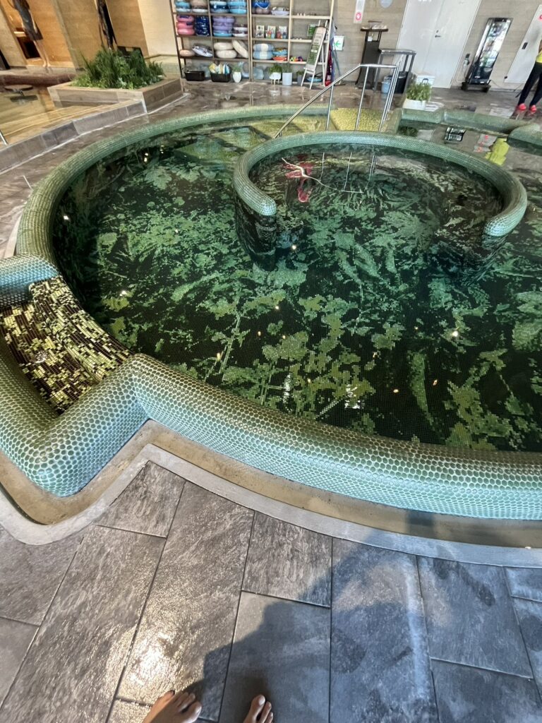 温水プールや木を中心にあしらった木造の風呂場があります。